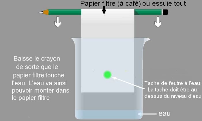 L'encre d'un feutre est le plus souvent un mélange de colorants. On peut séparer les colorants en faisant la manipulation suivante :