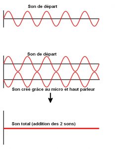 Le bruit est une onde : connu par sa fréquence en Hertz (Hz) et son niveau sonore en décibel (dB) . Pour effacer un bruit, Il suffit donc de produire une onde opposée. Quand les 2 ondes s’additionnent on obtient le silence. un micro capte le son ambiant et un haut-parleur produit le même son, …
