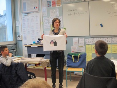 l’illustratrice et auteur Géraldine Alibeu est venue présenter son travail dans la classe ULIS. Les élèves avaient auparavant travaillé sur ses différents albums. Ils lui ont posé des questions , elle leur a montré des originaux d’illustrations d’album. Puis, ils ont pu pratiquer dans un atelier qu’elle a mis en place en utilisant la technique du collage et découpage.