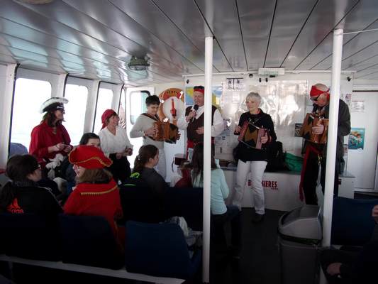 On a pris le bateau pour aller à Groix. On a fait le tour de l’île, puis on a chanté des chansons avec des personnes déguisées en pirates ou en sirénes. Ensuite, on a mangé sur une côte. On a mis un mot dans une bouteille qu’on a jeté à la mer.