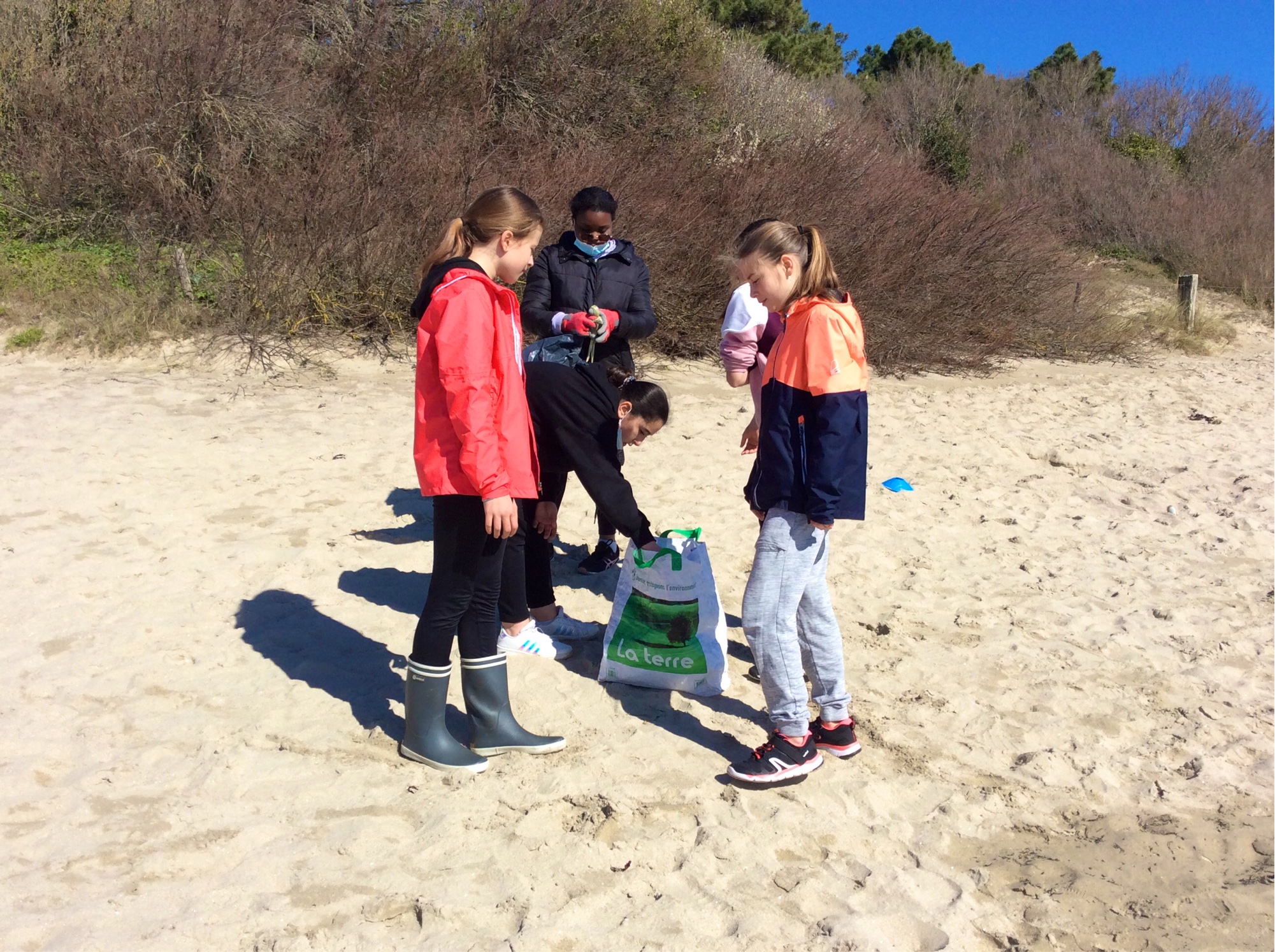 Les élèves de 6B sous un beau soleil breton , se sont rendus à la plage de Kerguelen afin de prélever des déchets en particuliers mésoplastiques (5 mm <plastique <25 mm) et microplastiques (<5 mm). Ces prélèvements seront envoyés très rapidement aux chercheurs de l’organisme Tara qui étudie la pollution par les plastiques des mers et des fleuves.