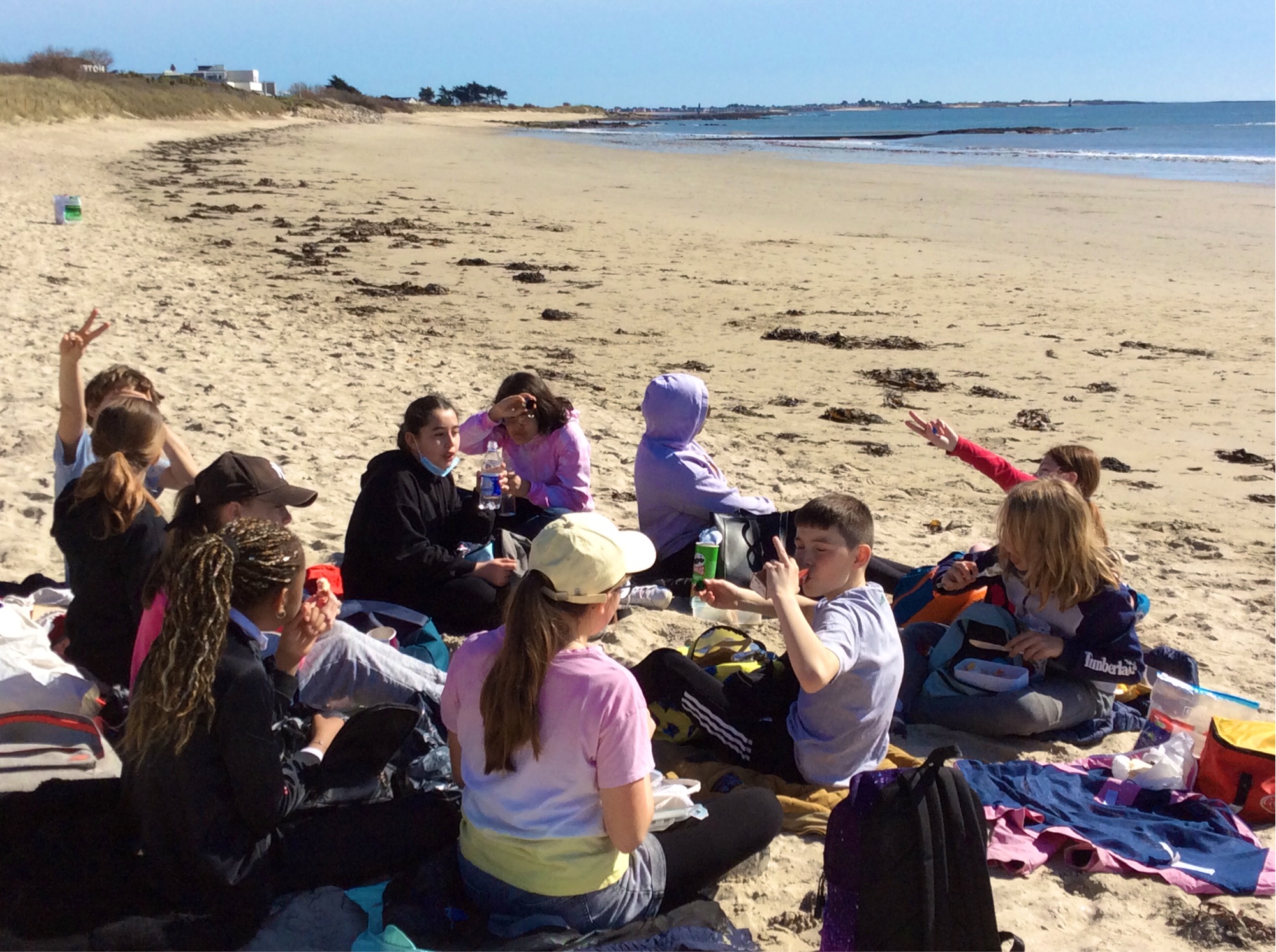 Les élèves de 6B sous un beau soleil breton , se sont rendus à la plage de Kerguelen afin de prélever des déchets en particuliers mésoplastiques (5 mm <plastique <25 mm) et microplastiques (<5 mm). Ces prélèvements seront envoyés très rapidement aux chercheurs de l’organisme Tara qui étudie la pollution par les plastiques des mers et des fleuves.