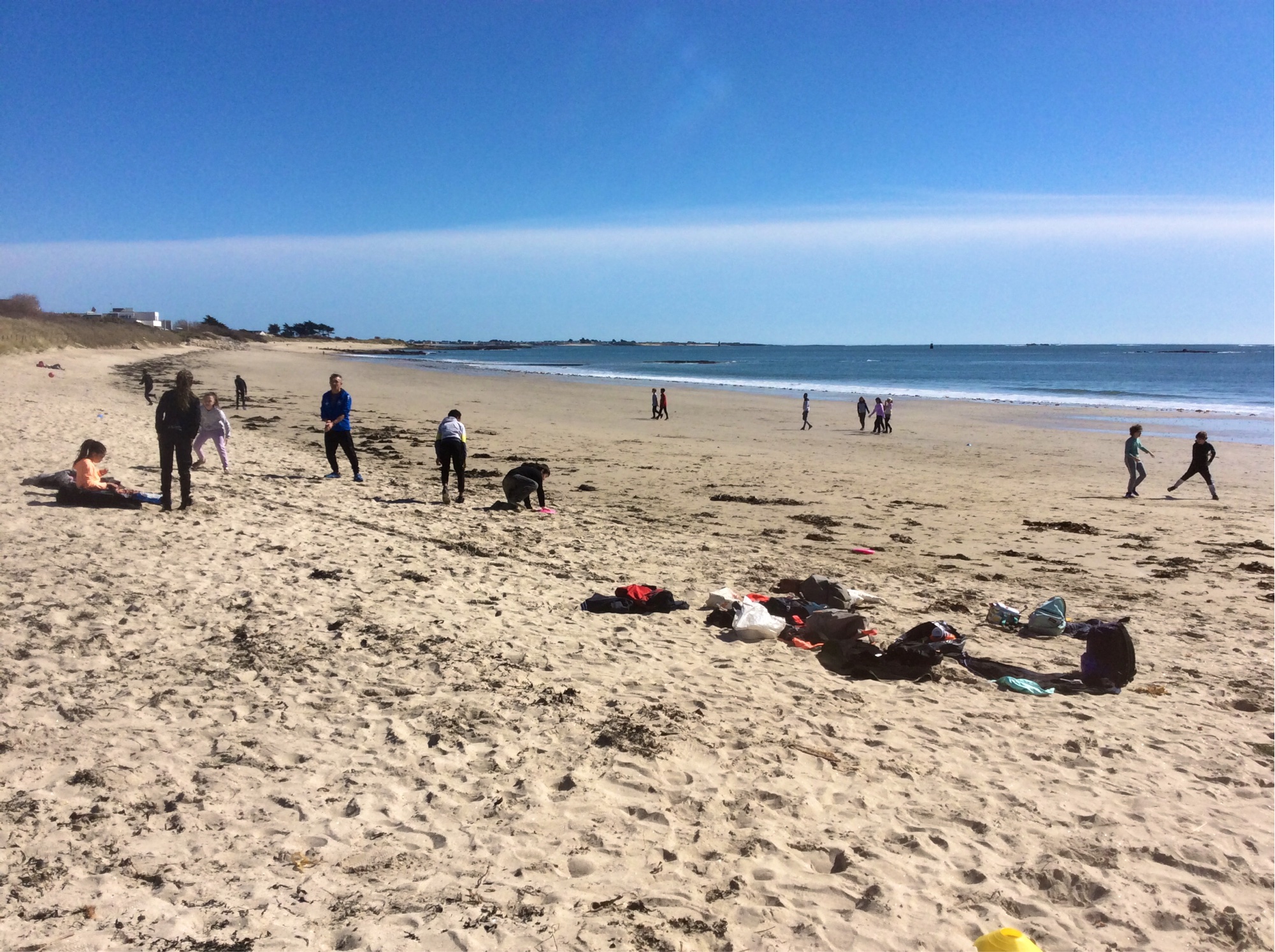 Les élèves de 6B sous un beau soleil breton , se sont rendus à la plage de Kerguelen afin de prélever des déchets en particuliers mésoplastiques (5 mm <plastique <25 mm) et microplastiques (<5 mm). Ces prélèvements seront envoyés très rapidement aux chercheurs de l’organisme Tara qui étudie la pollution par les plastiques des mers et des fleuves.